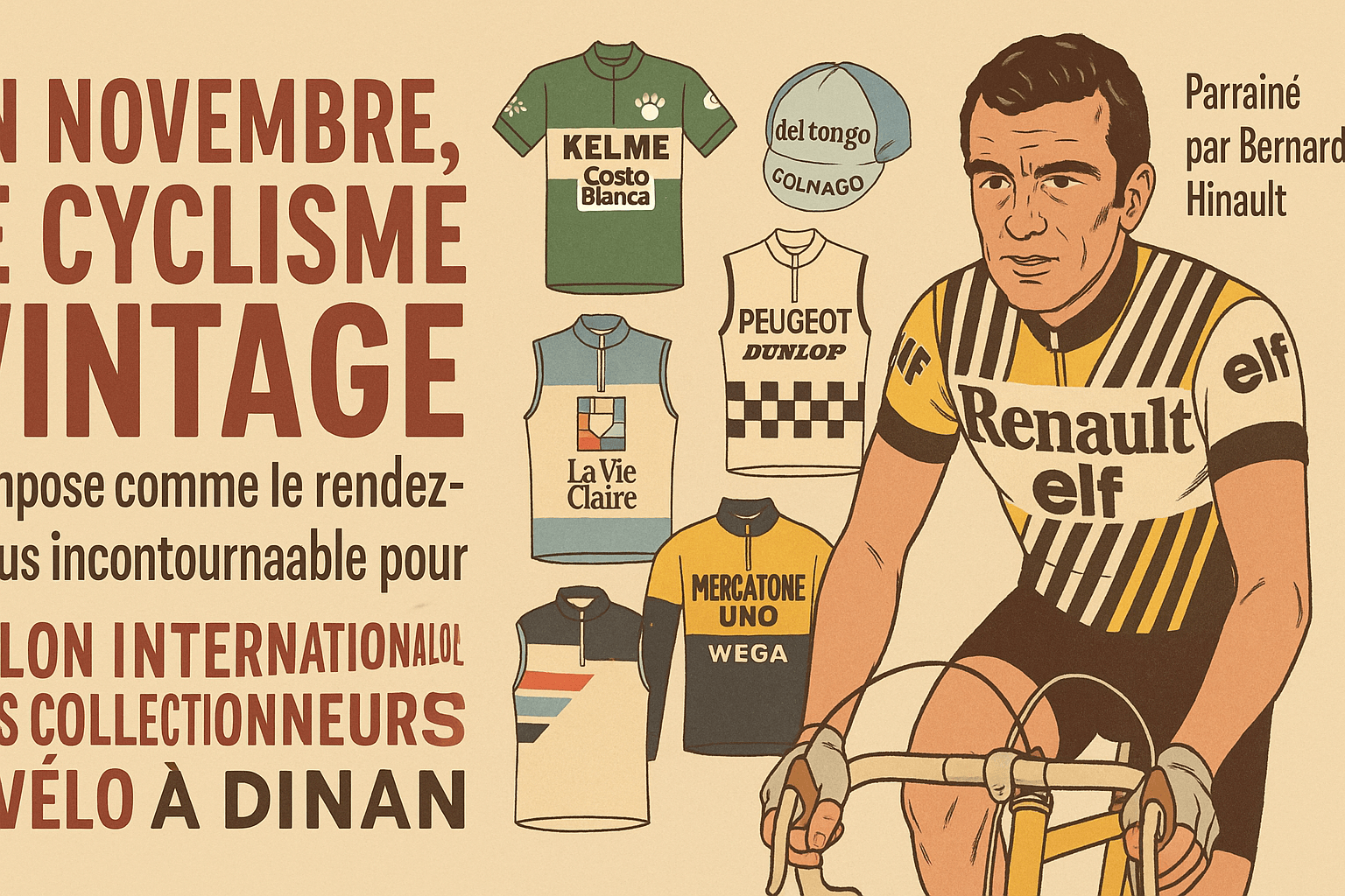 En novembre, le cyclisme vintage s’impose comme le rendez-vous incontournable pour les passionnés avec le Salon international des Collectionneurs de vélo à Dinan (15-16 novembre). Parrainé par l’inépuisable Bernard Hinault, cet événement attire chaque année amateurs et collectionneurs venus rencontrer d’anciens champions et admirer des maillots emblématiques, toujours porteurs d’émotions fortes.